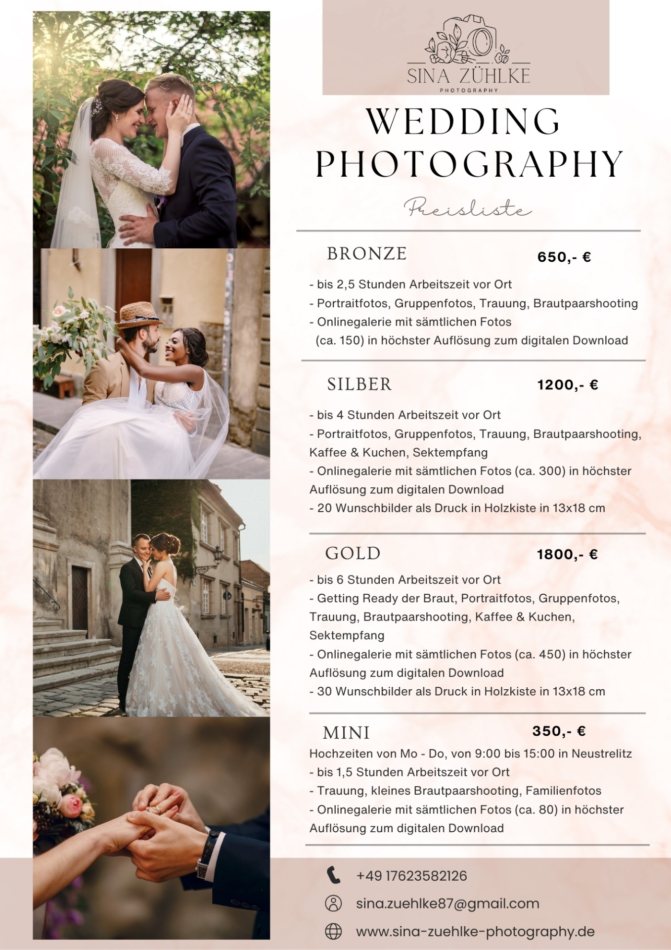 Zuzüglich 0,55 € pro km außerhalb von Neustrelitz. Die Fahrzeit wird mit 30,-€ pro Stunde berechnet. Als Anzahlung berechne ich 40% der Kosten, damit ihr als Brautpaar und ich als Fotografin uns auf diesen Termin verlassen können.